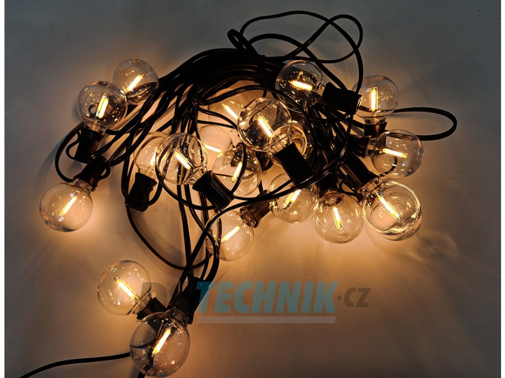 Praktické zahradní, kabelové svítidlo se solárním panelem - dekorační světelný řetěz, 20 žárovek E12 se svitem VINTAGE, lze umístit na terase, zahradě, u venkovního posezení, na plot, při různých slavnostech, svatbách atd. Délka kabelu je 10m.