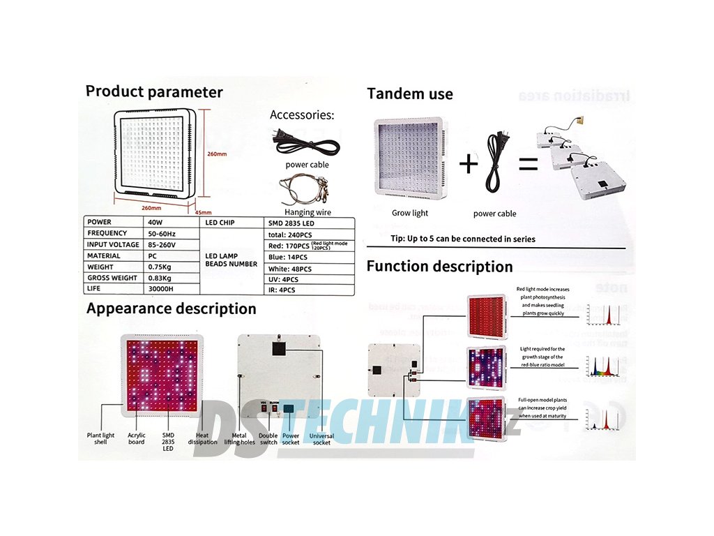 40-wattové vnitřní světlo pro růst má hodnotu PAR / PPFD 315 μmol / m2 / s. Využívá podstatně méně energie než alternativy HPS a je navržen tak, aby vydržel 35 000 hodin. Chladné LED diody s chlazením eliminují potřebu vedení a snižují riziko poškození / bělení listů. LED GROW LIGHT SJZX 40W je vybaven napájecím kabelem a je dodáván se závěsnou sadou. Toto svítidlo LED použijte pro celou řadu rostlin a aplikací, včetně zeleniny i legální marihuany, osvětlení zahradnictví, vnitřní zahradnictví, hydroponie a skleníky.