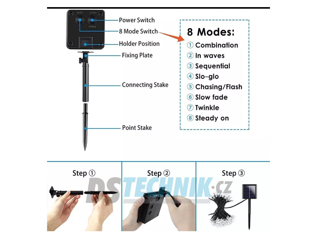 Světelný 10m řetěz je vhodný pro venkovní použití - jak na zahradu, tak třeba i na dům, stromy, atd. Osvětlení není výhradně určeno pro dobu Vánoc, ale můžete ho využít i pro dekorativní účely při zvláštních příležitostech.. LED diody jsou oblíbenou náhradou za klasické žárovky. Oproti klasickým žárovkám LED diody nevyzařují teplo, jsou odolné proti otřesům a můžete díky nim ušetřit téměř až 90% energie, které byste jinak spotřebovali u klasických žárovek. Průměrná životnost LED diody je 20.000 hodin svícení (normální žárovka cca 1000-2000 hodin v závislosti na svítivosti). Světelné funkce lze nastavit přímo na adaptéru. Každý řetěz obsahuje spínač přímo na adaptéru, pomocí kterého měníte mezi osmi způsoby svícení (blikání, pozvolné rozsvícení a další).